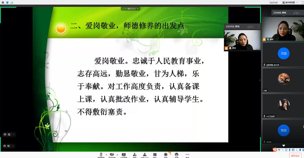 周雁翎结合《中小学教师职业道德规范》的相关要求,分别从爱国守法、爱岗敬业、关爱学生、教书育人、为人师表、终身学习等六大方面对教师的职业尊严和幸福进行了解读和阐述。她认为,爱国守法是师德修养的基础,守法不仅体现家国情怀、遵纪守法方面,更体现在工作生活中的细枝末节;其次,爱岗敬业是师德修养的出发点,作为一名教师,爱岗是前提,敬业是本分,选择教育事业,忠于教育一生;关爱学生是师德修养的灵魂,没有爱就没有教育,关爱学生是教师为师之本;教书育人是师德修养的核心,教书是手段,育人是根本,教师教学,既要立德,更要树人;为人师表是师德修养的关键,教师在生活工作中要以德立学、以德育人,做到学高为师、身正为范,以德施教、为人师表;终身学习是师德修养的时代要求,新时代、新形势、新要求,教师需要不断学习、持续完善、追求卓越、与时俱进。在进行理论阐述的同时,周校长还不断结合自身从教为师的经历,用风趣幽默、热情洋溢的语言向同学们深入浅出地分享了对教育经典的理解和自身教育教学的做法,用自身的案例,使同学们感受了从新手教师到优秀教师再到专家型教师的成长经历,也体会了教师教书育人的完美统一。