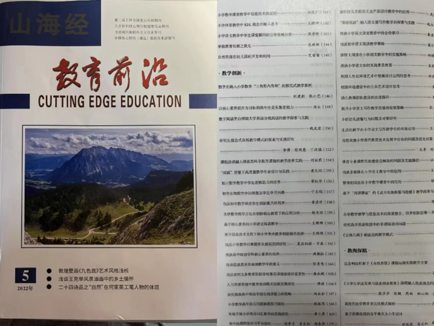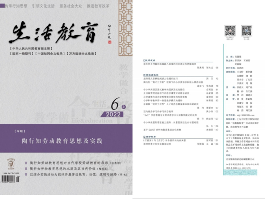 近日,我院小学教育专业研究生张海涵(导师付永昌教授)在《生活教育》发表《陶行知“育才三方针”观照下的小学英语学科核心素养培养》文章,研究生张小艺(导师刘建新博士)在期刊《教育前沿》发表《数学史融入小学数学“三角形内角和”的探究式教学案例》文章,同时另一篇文章《数学史融入“分数除法解决问题”的教学设计探究》也在期刊《科学与技术》刊发。
