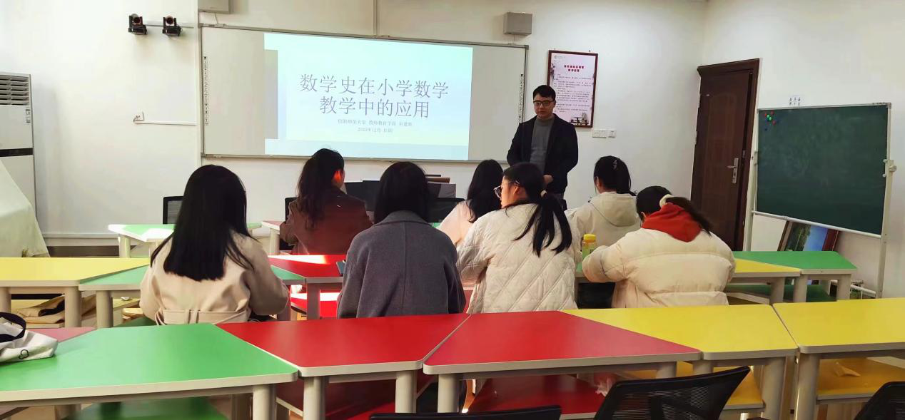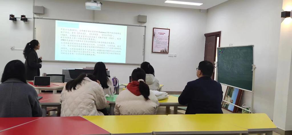 为促进同学们理解数学史与数学教育,并结合数学史开展具体教学设计,刘老师给大家指定了阅读书目《HPM(History and Pedagogy of Mathematics):数学史与数学教育》。首先,刘老师向同学们简介了数学史及其在教学中的应用。接下来,同学们分3个小组进行阅读汇报,并分别将数学史融入某一具体主题的教学中去,设计了小学数学相关知识点的典型教学案例。最后,针对各组汇报,刘老师进行了精要点评和总结。