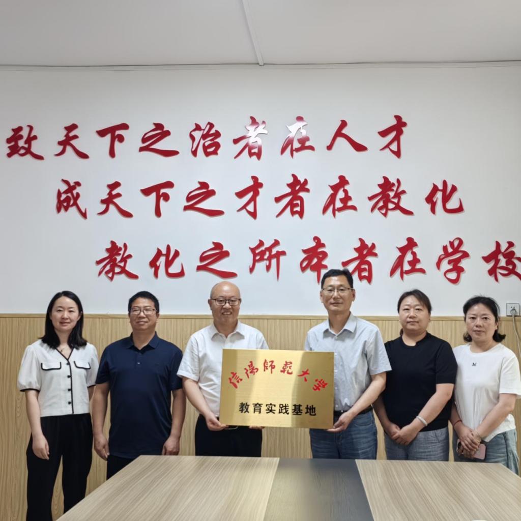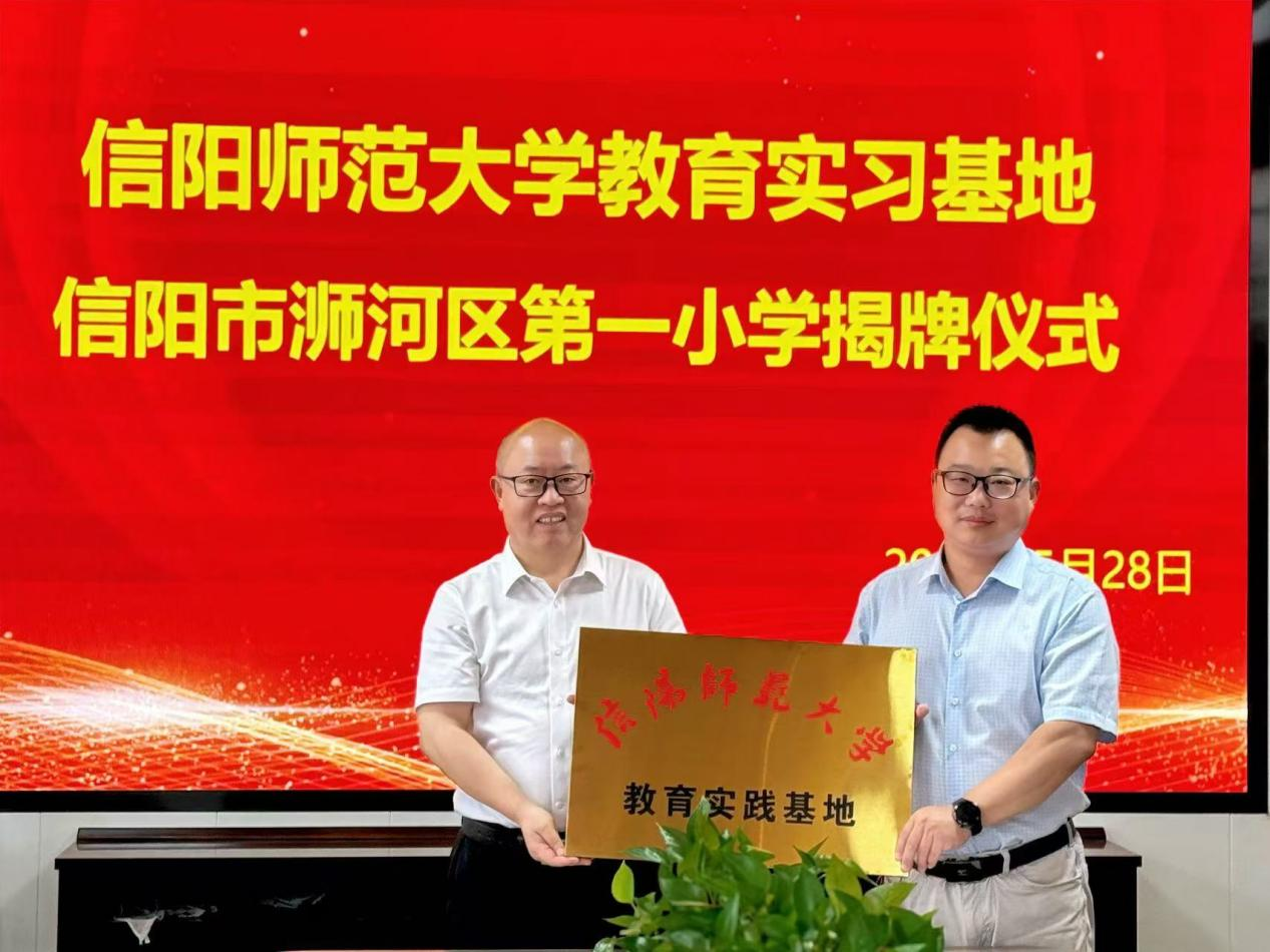 5月28日,太阳成集团tyc151cc院长李文田、实践中心主任张祥耀、科研与研究生秘书常燕燕一行赴信阳市浉河区第一小学、浉河区第五小学举行教育实践基地签约仪式。信阳市浉河区第一小学校长田宽、浉河区第五小学校长许勇等两校领导班子成员出席签约活动。