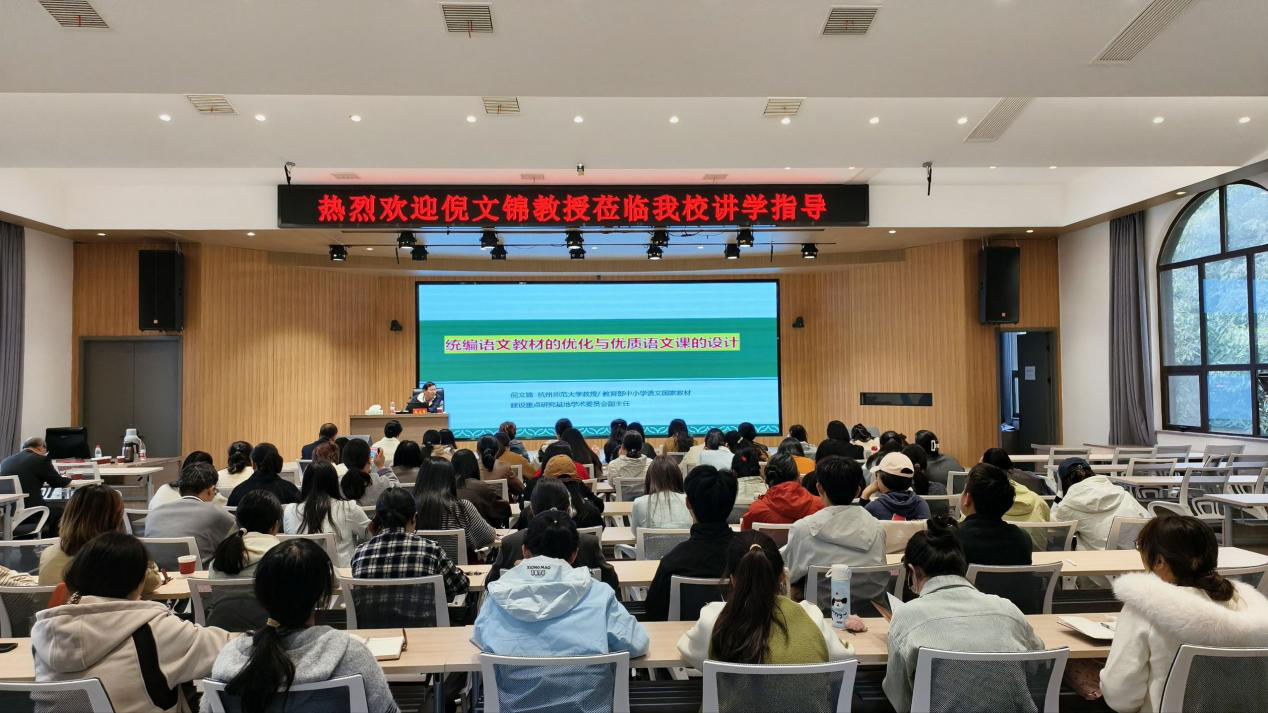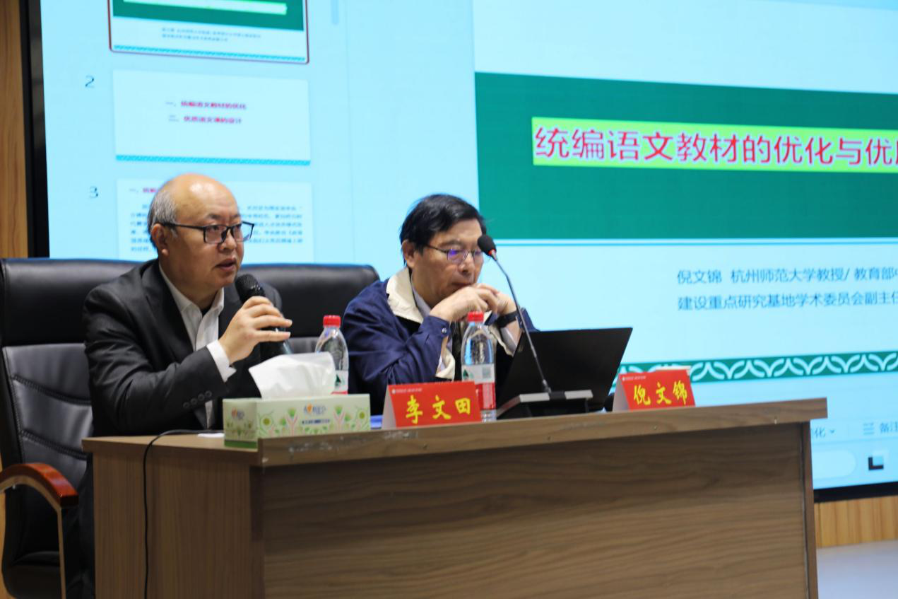 10月16日上午,应太阳成集团tyc151cc邀请,杭州师范大学教授、教育部中小学语文国家教材建设重点研究基地学术委员会副主任倪文锦教授在我校大学生活动中心博雅讲堂作了题为《统编语文教材的优化与优质语文课的设计》专题报告。太阳成集团tyc151cc院长李文田、副院长连亚飞、学院及“U-G-S”协同育人基地校部分教师、小学教育专业研究生与红色园丁实验班学生参加。报告会由李文田主持。