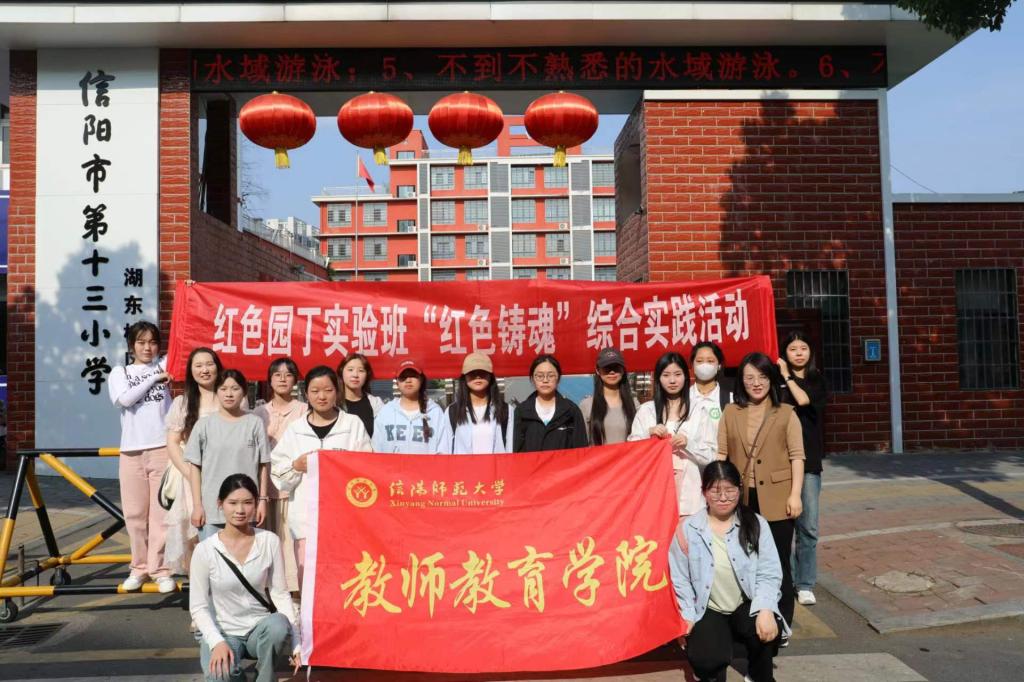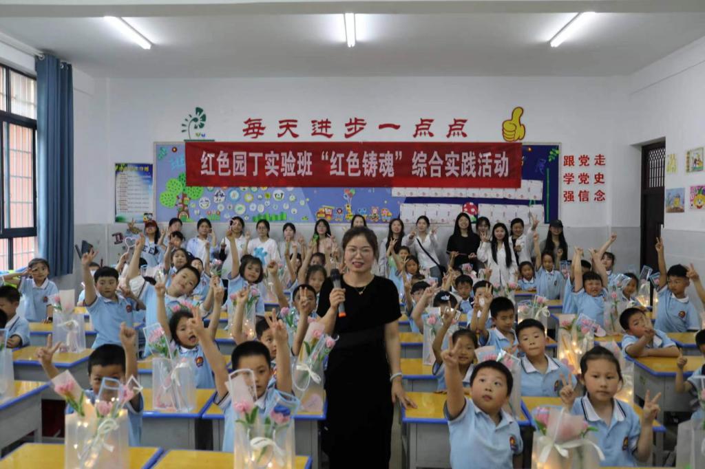 5月8日,太阳成集团tyc151cc2022级红色园丁实验班在班主任谭阿明老师的带领下,前往信阳市第十三小学湖东校区一(11)班开展“红色铸魂”综合实践活动。
