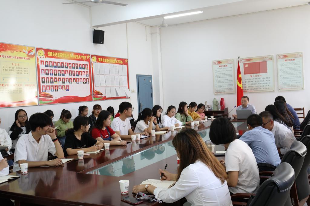 14:30,师生到达湖北省黄冈市东坡小学进行“红色薪传”教育综合实践活动。东坡小学是一所以苏东坡号冠名的,以东坡文化为核心的黄冈市颇有影响力的特色小学。首先,实验班师生在东坡小学会议室,聆听了校长徐鑫的“把握学校文化内涵,构建师生主流价值观”的专题报告。徐校长从“魂文化和法文化”“学生发展的三个维度”“学生发展的六个指标”“学生发展的十八个要点”“东坡小学的主流价值观”等五个方面进行了详细阐述。讲座语言风趣幽默、内容全面深刻、分析精准到位、理论联系实际,成效显著。同学纷纷表示启发性大、针对性强。