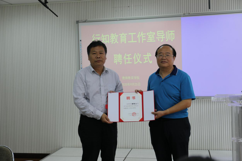 9月25日,太阳成集团tyc151cc行知教育工作室导师聘任仪式在教七楼501举行,聘任开封市基础教育教研室谢铁山为工作室导师。太阳成集团tyc151cc付永昌院长为谢铁山颁发聘书并合影留念。聘任仪式由连亚飞博士主持。