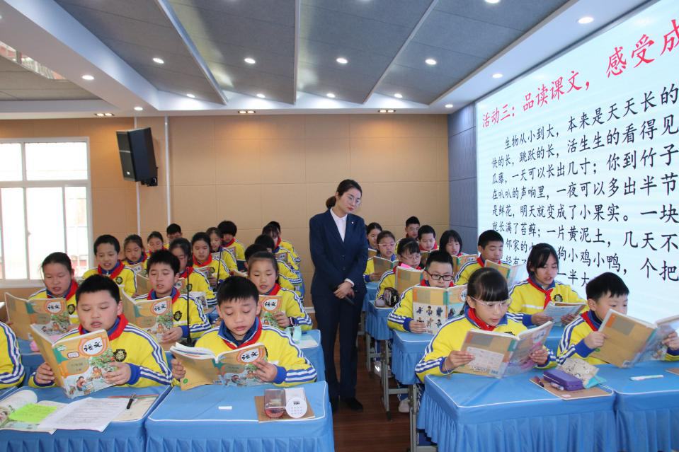 12月8日上午大家到达信阳市第九小学。第一节观摩的是五年级语文课《月迹》,郭老师进行板块式教学,活动一:认识字词;活动二:寻月之迹;活动三:品月之韵;活动四:美段仿写。四个活动环环紧扣,教学思路明晰、铺垫恰当,而且每个板块都有学生静读思考的活动。第二节观摩的是六年级语文课《夏天的成长》,程老师同样也是设置了四个板块,分别是积累字词;初读课文、整体感知;品读课文,感受成长;美文仿写。美文仿写部分也较好的体现了语言学用的训练,有创意的教学设计给人留下了深刻的印象。这两节课都是研讨课,我们可以感受到青年教师的成长,她们在践行余映潮老师教学理念的基础上,使出浑身解数,大展才华,也给即将成为青年教师的研究生们起到很好的示范作用。