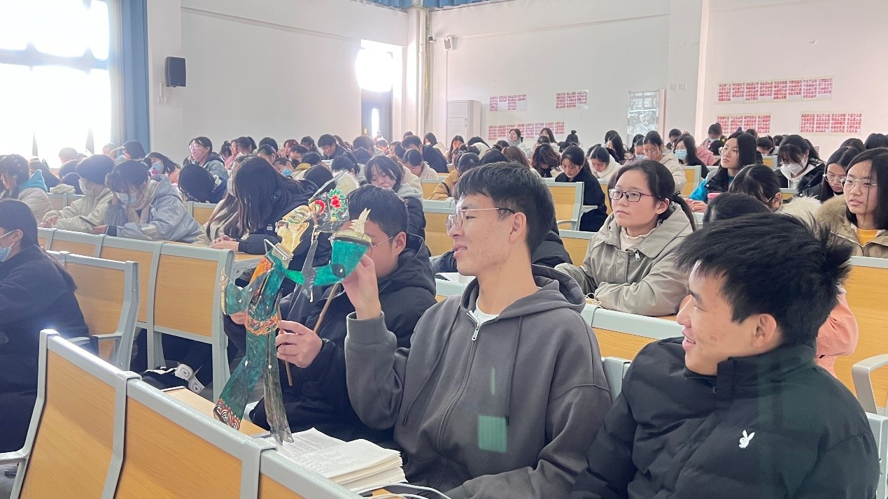 郭德华教授由豫南地区的五种音乐艺术种类作为报告主线,围绕“戏曲音乐”、“民间舞蹈”、“民间歌曲”、“民间器乐”、“曲艺音乐”五个领域进行了深度介绍。首先,郭教授结合自身专业背景知识与本地文化、生活,从中国的不同方言、不同文化发展历史为序幕展开讲座。然后,郭教授结合信阳独特的地理位置,介绍了戏曲音乐中的豫剧、丁香戏、花鼓戏等主要的豫南戏曲音乐文化;民间舞蹈中的花挑舞、花伞舞、花扇舞;民间歌曲中的号子、山歌、田歌、红色民歌等内容。在互动环节过程,郭教授带来自己收藏的皮影道具,让学生亲身感受皮影表演过程,了解皮影戏的独特文化。最后,在郭教授与全班同学共同演唱信阳著名红色歌曲“八月桂花遍地开”的歌声中结束了本次的音乐文化报告。
