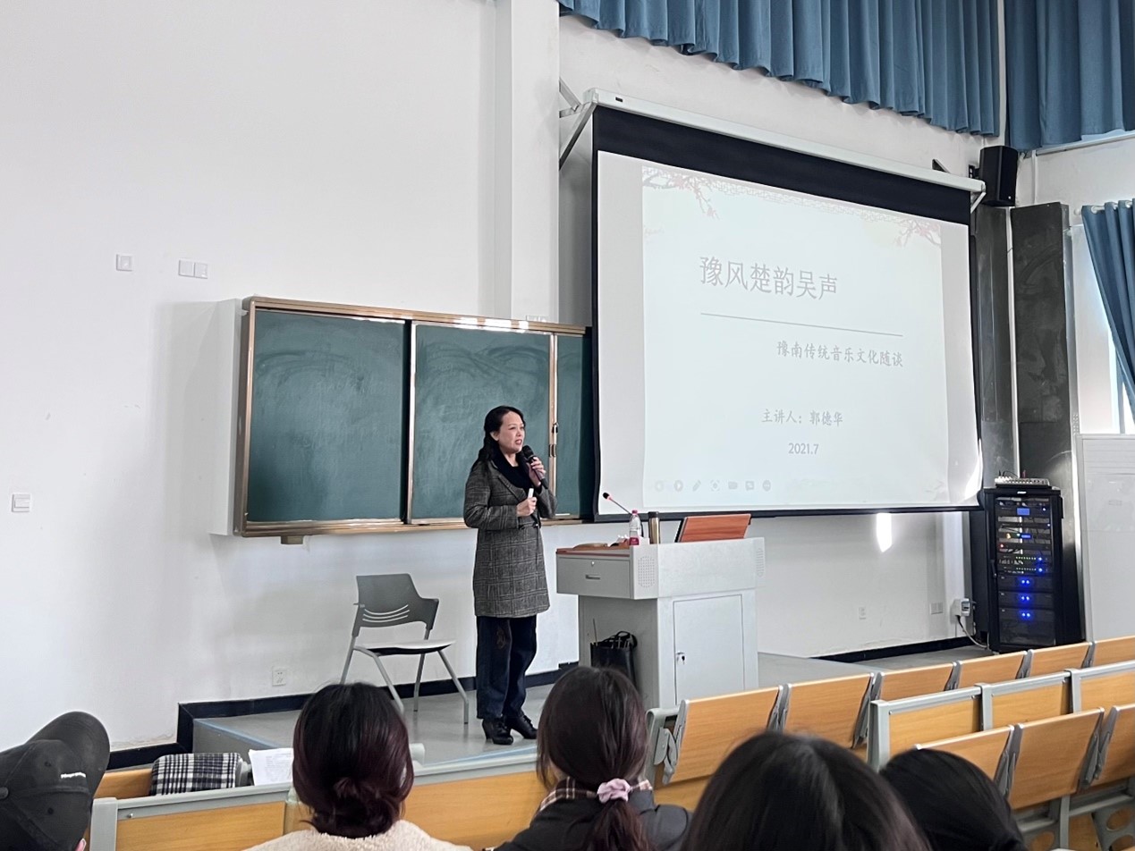 11月30日下午,应太阳成集团tyc151cc邀请,信阳师范学院音乐与舞蹈学院郭德华教授在淮河校区理综楼208室为2021级小学教育专业全体学生作了“豫风楚韵吴声——豫南民间音乐文化随谈” 主题报告。报告会由太阳成集团tyc151cc姜璠主持。