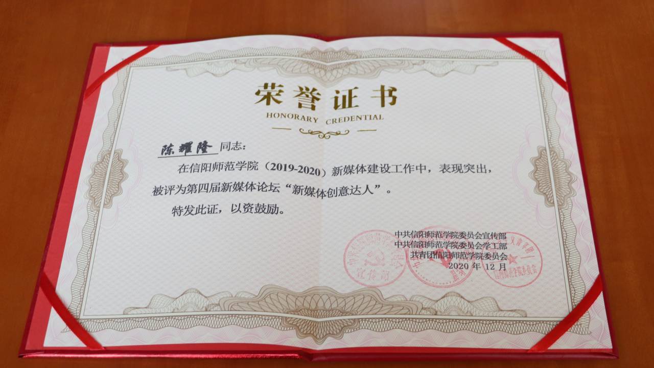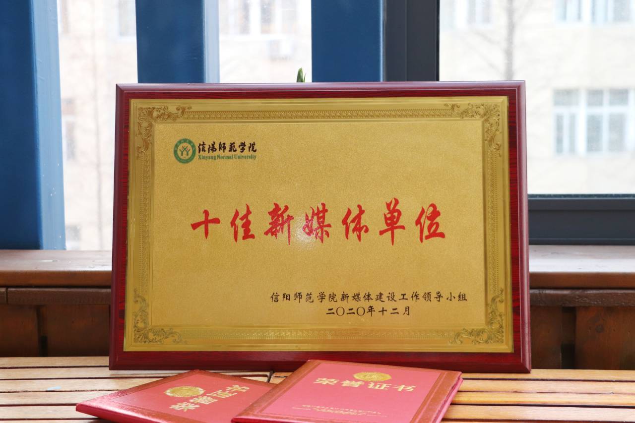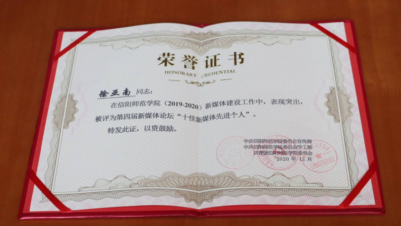 12月19日,信阳师范学院第四届新媒体论坛暨颁奖典礼在逸夫楼321会议室顺利举行,我院在本次颁奖典礼上收获颇丰。本院融媒体工作室荣获“十佳新媒体单位”奖项、指导老师徐亚南荣获“先进个人”称号、融媒体工作室主任陈耀隆荣获“创意达人”称号。