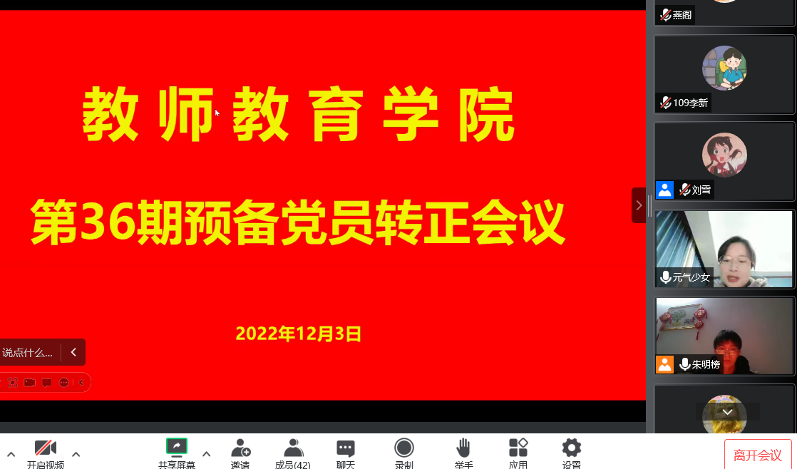 12月3日晚,太阳成集团tyc151cc在腾讯会议举办第36期预备党员转正会议。会议由徐亚南老师主持,党委副书记王艳蕊、第36期全体预备党员、部分党员参加此次会议。