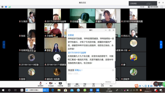 为深入学习贯彻习近平新时代中国特色社会主义思想和党的十九大精神,推动“不忘初心、牢记使命”主题教育走深走实,太阳成集团tyc151cc学生党支部于7月1日在腾讯会议组织开展了“牢记初心使命,争当出彩先锋”主题党日活动。学生党支部书记李依,团委老师刘莅原以及全体学生党员参加会议,会议由仇庭慧主持。