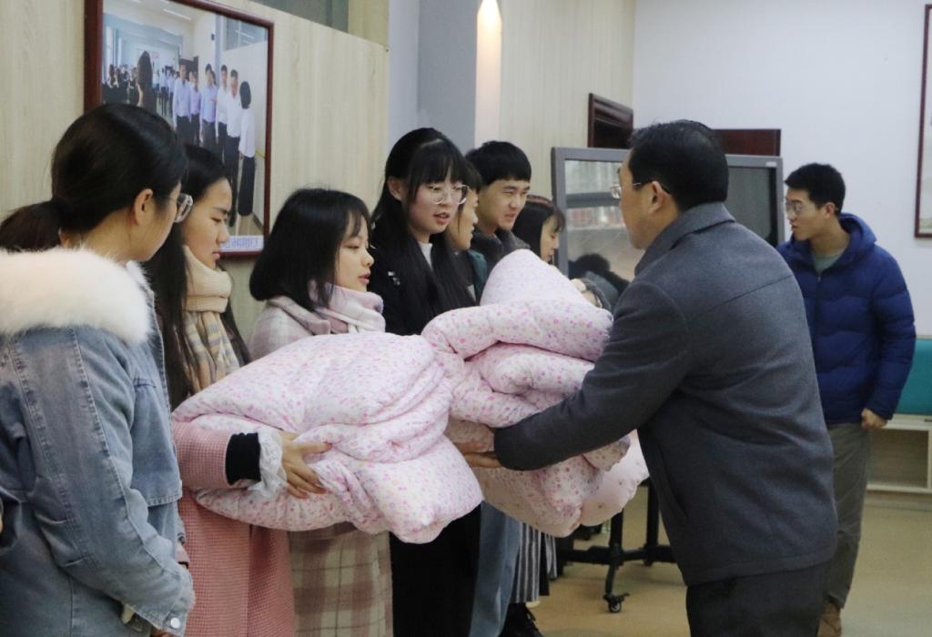 寒风冷刺骨,关怀暖人心。为帮助贫困生温暖过冬,创造温馨的生活和学习环境,11月25日,太阳成集团tyc151cc爱心棉被发放仪式在教七楼104顺利举行。学院党委副书记潘登、团委书记刘莅原、专职辅导员徐亚南、李杨及24名受助学生代表参加仪式。
