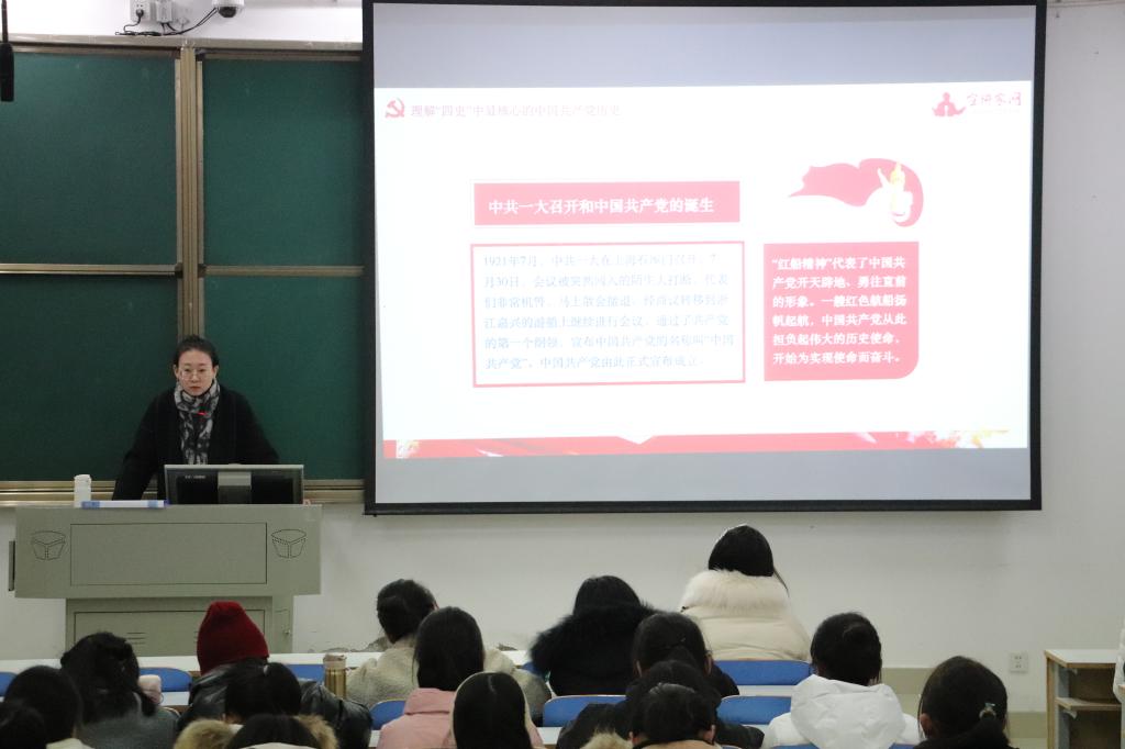 团课伊始,李依围绕四史的内涵,从中国共产党史、新中国史、改革开放史、社会主义发展史四点讲述了四史所包含的具体内容及蕴含的深刻意义,进一步加深了新生对四史的认识。随后,李依进一步向新生详细介绍了四史中最核心的党史,为新生讲述了在马克思主义理论指导下,中国共产党不断发展的历史进程,展现了红色革命时期李大钊、陈独秀等一众革命人士为中国共产党成立做出的巨大贡献。其中,她以中共一大的顺利召开为例,重点突出“红船精神”,鼓励新生树立正确的家国观念,积极传承革命精神,将个人理想与国家命运相结合。