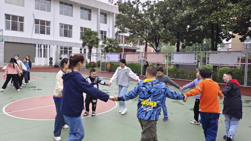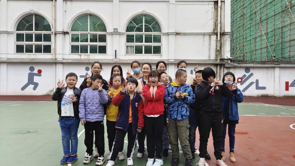 室内教学过后,志愿者和学生在老师的陪同下来到操场,上午10:00,一行人在操场中展开了室外活动。随着音乐响起,志愿者和学生们共同伸展四肢,跟随律动做出相应的动作。室外集体活动不仅拉近了学生之间的距离,增进了他们的团体意识和凝聚力,对特殊儿童身心健康发展具有重要意义。40分钟后,活动课在欢声笑语中圆满结束。