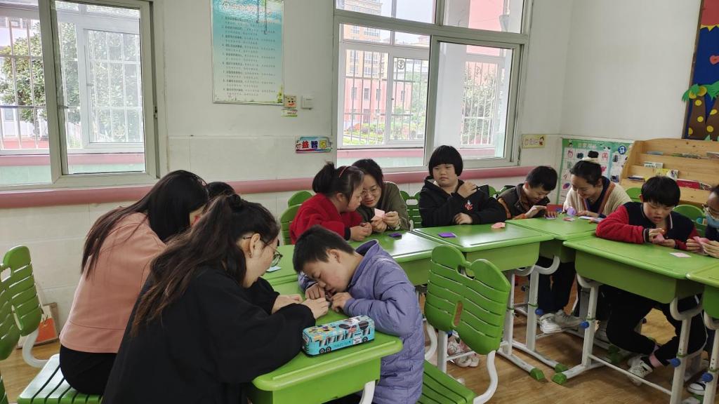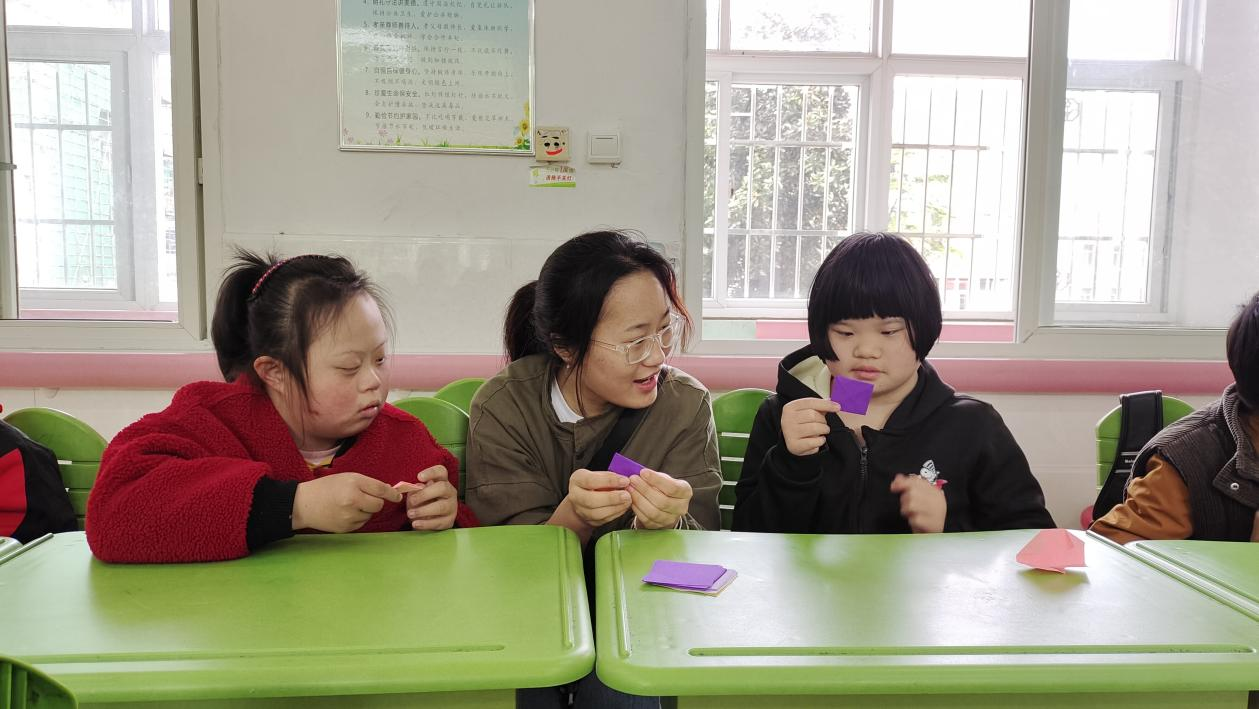 9:00,志愿者为这些特殊儿童准备了彩色折纸,为他们上了一节别样的手工课。在学校老师的帮助下,采取一对一的教学,为培养这些儿童的动手能力提供了更好的方式。上课期间,志愿者们细致耐心,手把手教学,反复示范并不断和他们进行交流,学生也积极配合,努力跟随志愿者做出正确的步骤,一节课结束,学生们都能学会基本的折纸方法。这种一对一的模式有效的提高了特殊儿童动手能力,也让他们感受到了来自外界的关爱,促进了特殊儿童与他人的沟通。