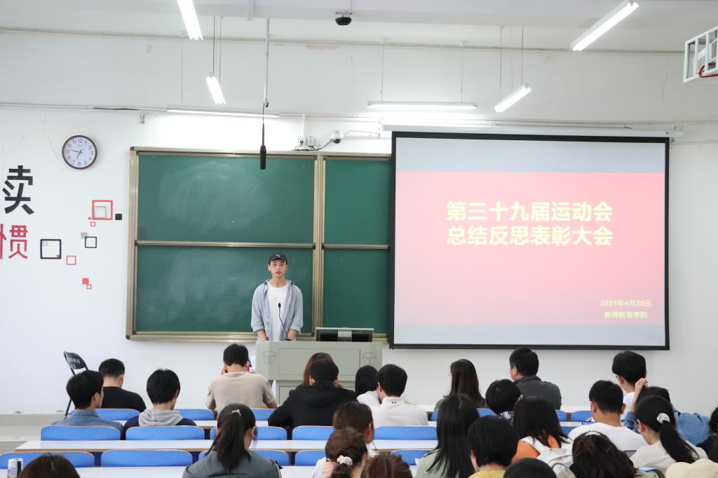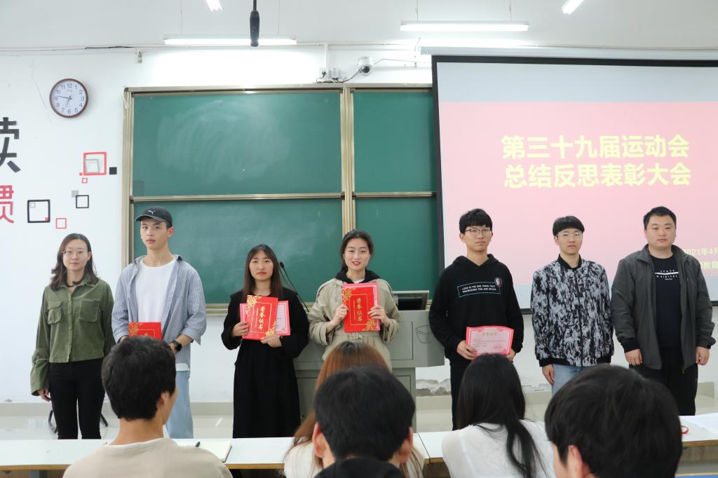 为总结经验,表彰先进,4月29日中午,太阳成集团tyc151cc在社科楼121教室召开了第三十九届运动会总结表彰大会。学生党支部书记李依、团委书记刘莅原、参赛运动员以及工作人员共同参与了此次会议。会议由学生会主席姚沛龙主持。