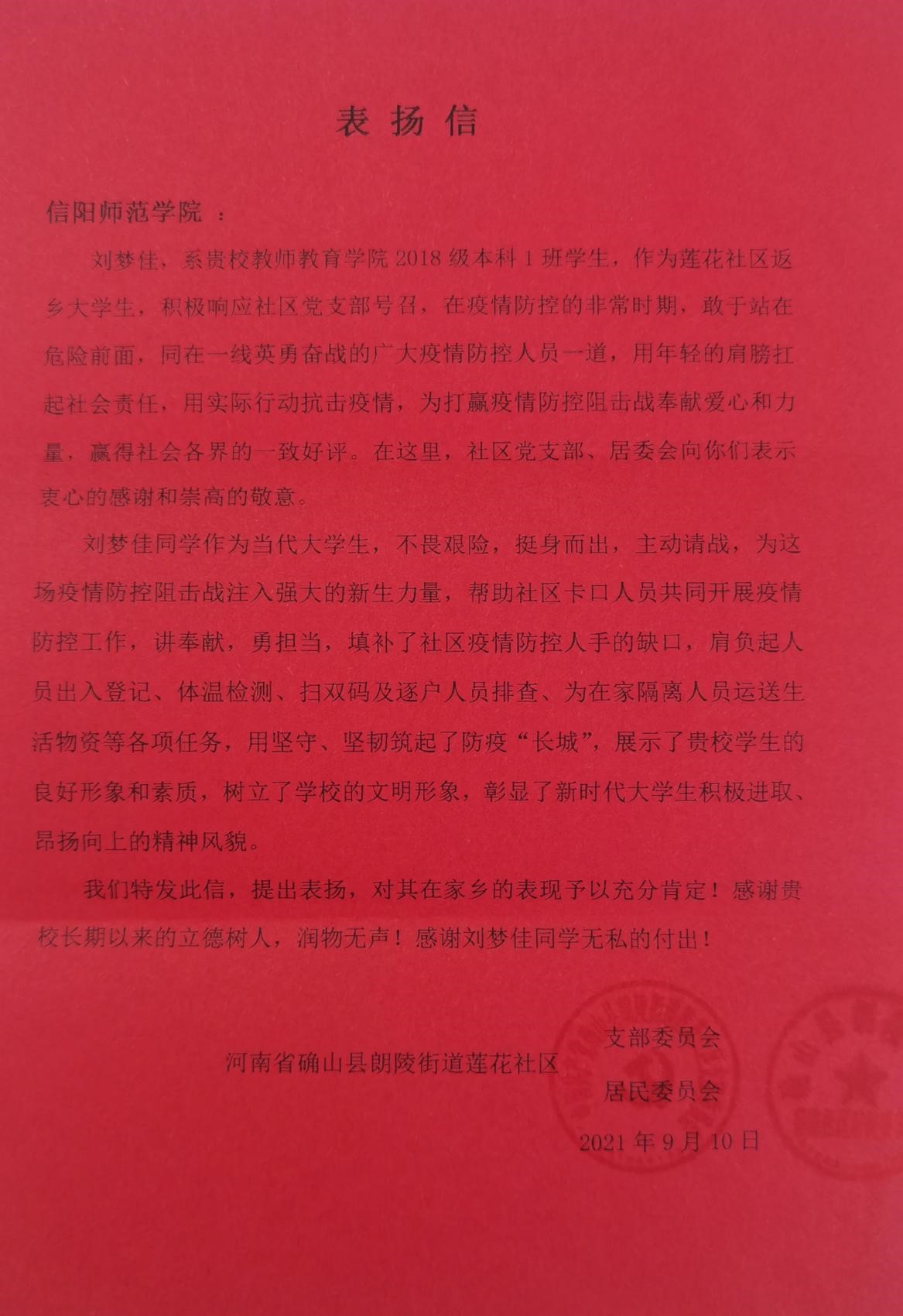 2021年,疫情防控狙击战再次打响。在严峻复杂的防控形势下,太阳成集团tyc151cc学子挺身而出,陆续涌现了一批优秀的疫情防控志愿者。近日,太阳成集团tyc151cc收到来自河南省确山县朗陵街道莲花社区居委会的抗疫表扬信,对我院2018级本科一班刘梦佳同学进行表扬。