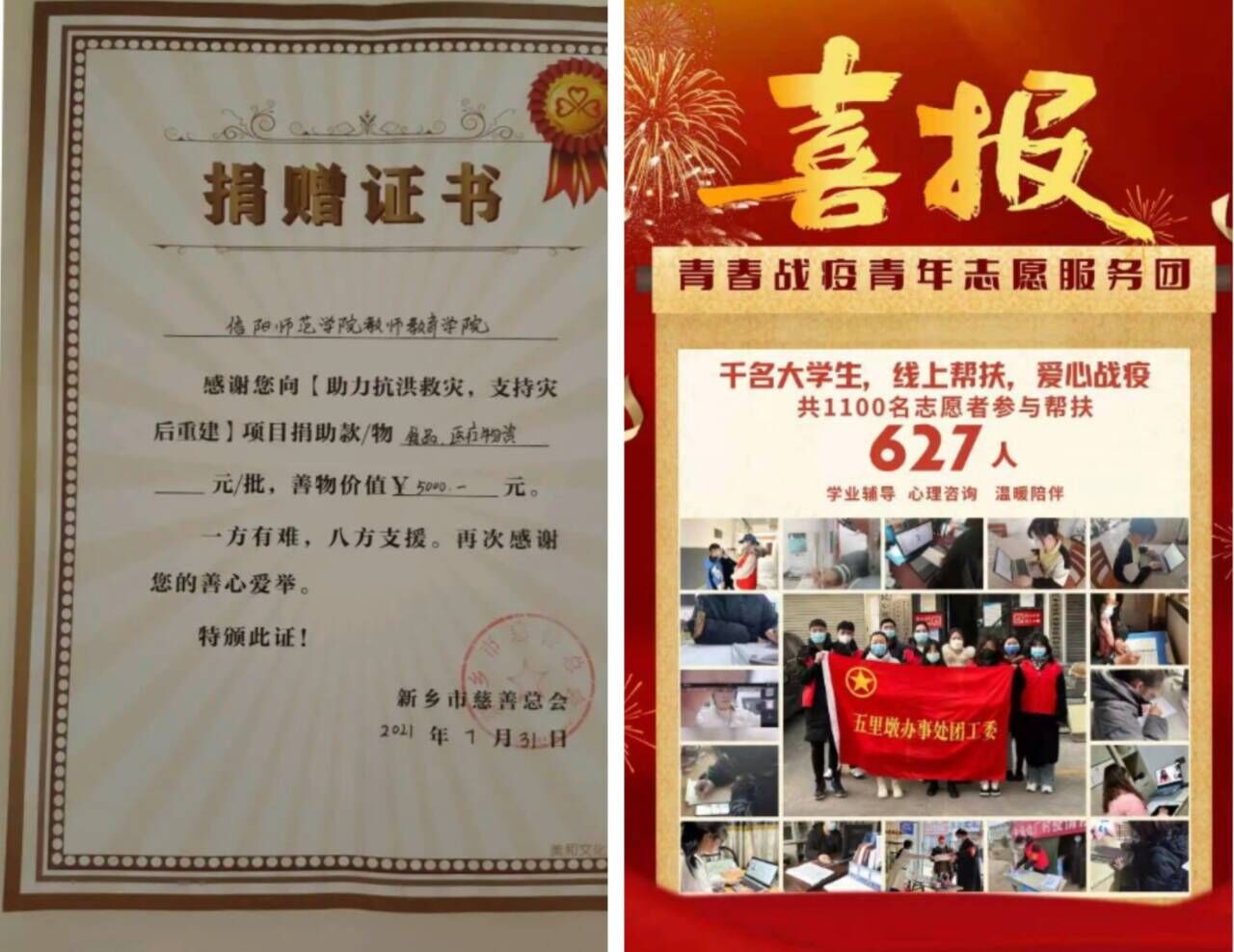 从2021年七月的洪涝灾害到2022年一月再度袭来的疫情,我院学子都闻讯而动,积极响应团委号召,助力地区防洪抗疫。19级学生王晶晶深刻牢记自己作为一个共产党员的重要责任,在暴雨侵袭居民房屋时,帮助所在区域房屋受损严重的居民进行家庭受损情况的登记并介绍需要准备的相关材料,对年纪较大的住户进行耐心的讲解,协助填写相关信息,助力灾后恢复;20级学生董梦瑶作为区域内的志愿服务队队长,积极召集队员参与到志愿活动中,管理人员分配任务,协助社区工作,帮助人们了解防疫政策,查看社区进出人员的行程码,为疫情防控贡献出属于自己的一份力;19级学生雷乐乐结合自身专业优势参加了线上致“青春”战疫活动,扎实备课,积极辅导学生,与学生一起共同进步,用自己的行动,书写志愿精神,努力彰显青春活力。