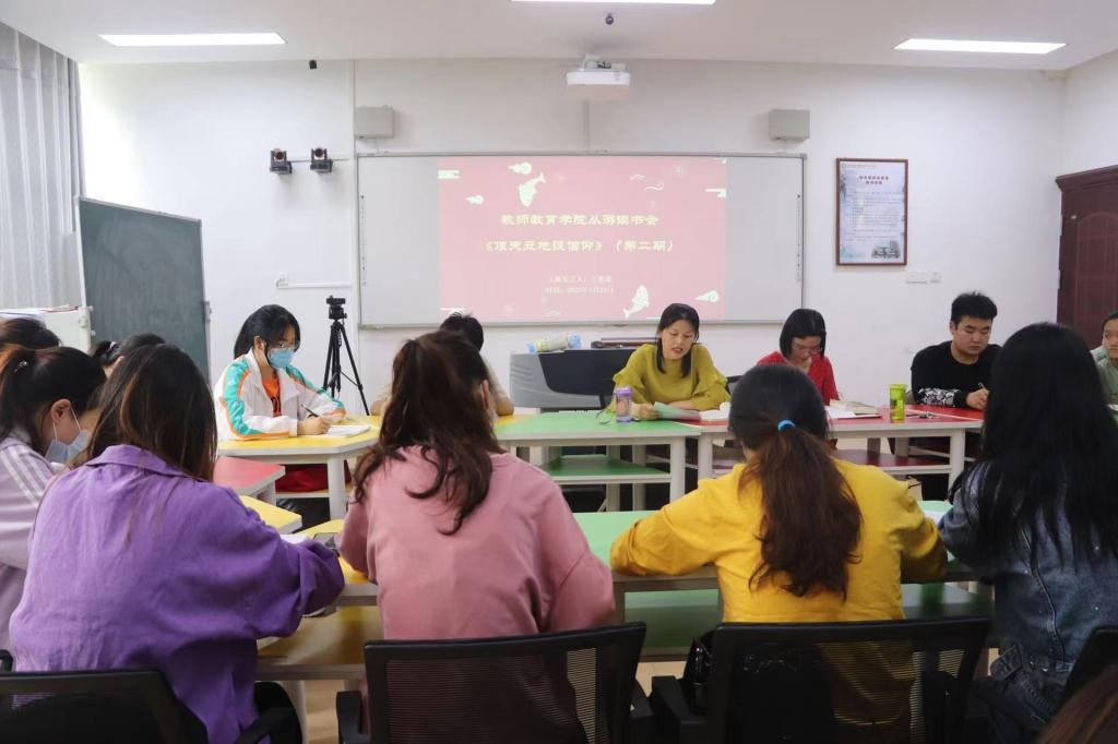 5月26日中午,我院在教七402教室举办了第二期从游读书活动,师生共同阅读《顶天立地谈信仰:原来党课可以这么上》一书,本次读书会由学院党委副书记王艳蕊担任主讲人,活动由徐亚南主持。