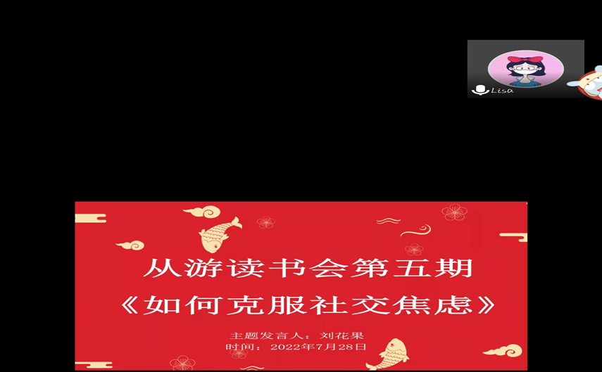 为缓解大学生社交焦虑,关心大学生身心健康,7月28日晚,第五期从游读书会活动如期在线上举办。师生共同就《如何克服社交焦虑》一书进行了沟通交流,本次读书分享会主讲人为刘花果,活动由李清政主持。
