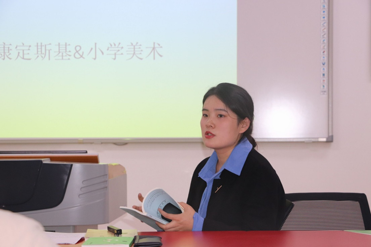 康文慧将费德门教授的“欣赏艺术作品的方法程序”引入到本期读书会中,从作者介绍、作品特点、作品理解、作品风格的转换四个角度对《艺术中的精神》进行讲述。她通过图片欣赏与书本的结合、作者经历与艺术精神的结合,将书中的内容呈现出来,提出了要透过作品看到本质,美无对错,重要的是发自内心的观点。此外,针对我院的教学特色,她提出了康定斯基与小学美术的结合,将艺术融入教育,在欣赏艺术中达到美育的效果。在答疑交流环节中,李清政同学就该书提出了辩证看问题、终身学习等观点,读书会在思想碰撞中营造了良好氛围。会议最后,徐亚南作总结发言,她向与会人员提出了坚持读书,着眼于自身的成长,让刻苦读书成为强心剂、美容剂,为青春发展注入强大动力的建议。