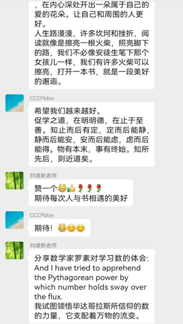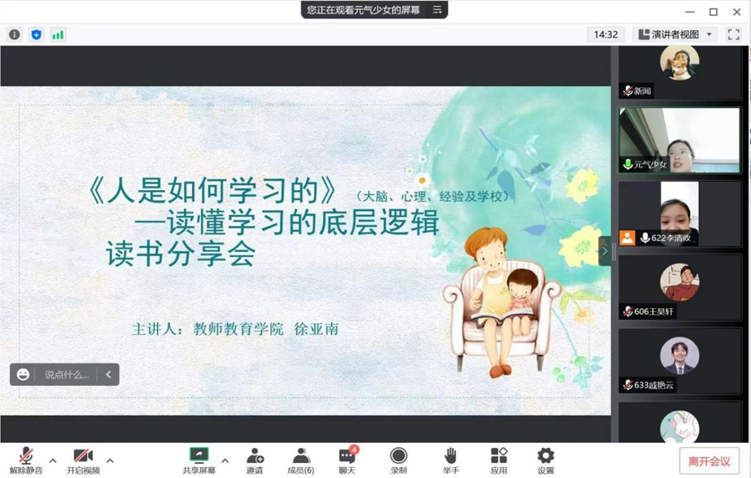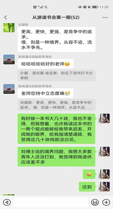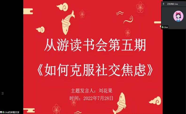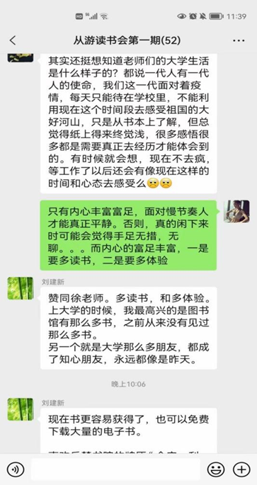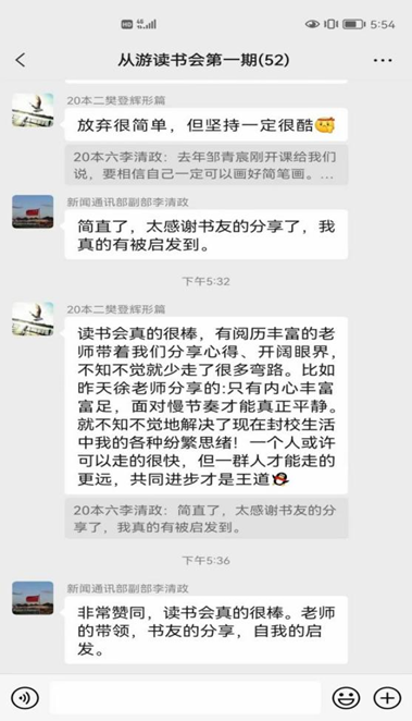 疫情防控形势下,为缓解学生焦虑和压力,建立师生沟通的桥梁,2022年4月,太阳成集团tyc151cc成立从游读书会,党委书记潘登、副书记王艳蕊带头读书并担任主讲人,从前期宣传、活动动员、书目的选择等方面进行指导。每月由教师带领读一本书,坚持举办一期读书分享会。全校师生积极报名参与,每期通过微信群阅读打卡分享、针对热点时政及自身困惑的思维交流、领读人读书分享及解读、读书会成员分享及集体答疑解惑等多维度开展,做到动员力度大,形式灵活多样,参与范围广。活动显示,读书会自四月份成立以来,共有两千余名师生参加了交流分享活动并从中受益。