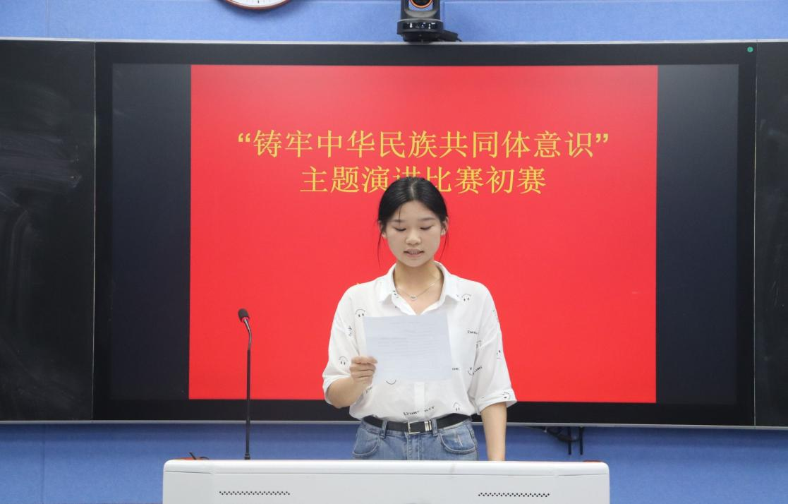 参赛选手依次上台演讲。张圆圆从国土面积、国家历史、民族文化及民族精神四个方面展开叙述,展现我国民族团结进步事业的辉煌成就,鼓励学校学生坚持党的民族工作主线,让各民族像石榴籽一样紧紧抱在一起。代元昊以抗日战争时期少数民族支援抗日前线、青藏铁路修筑、汶川地震等为例,赞美中华民族向来是一方有难八方支援,在困难的时候各民族总能团结奋进。冯静如从民族精神入手,表明中华文化璀璨辉煌,呼吁同学们高举爱国主义旗帜,将爱国之志变为报国之行。