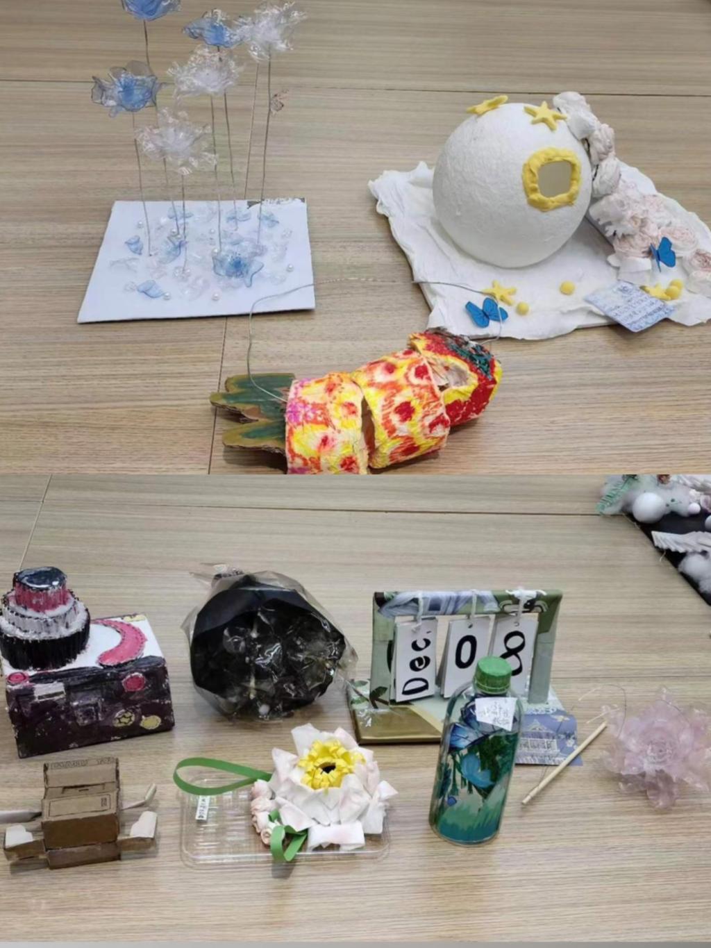 通过创新和创造性的手段,将废弃物转化为有用的物品,从而减少对环境的污染和资源的浪费。喝完的饮料瓶、拆完的快递盒、用过的卫生纸等闲置物品,摇身一变成了漂亮的太空屋、纸风铃、永不凋谢的塑料花等,学生们的奇思妙想为这些废品注入了有趣的灵魂,一系列精美小摆件都让人看了爱不释手,真正做到了废品循环利用的价值。