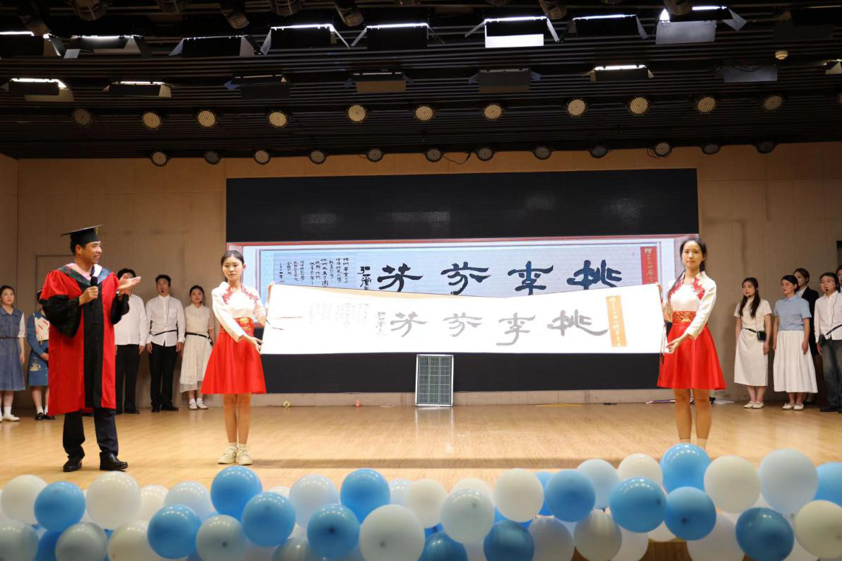 典礼开始,全体师生肃立,共同奏唱中华人民共和国国歌。典礼上,毕业生代表李俭俭和杨芳进行发言,她们对大学四年的生活进行了回顾,并对学校以及学院的培养表示真挚的感谢。随后,我院党委书记潘登进行发言致辞,他对同学们过去四年的学习生活给予了肯定,并对大家未来的发展提出了殷切的期望,也对大家未来的道路进行了指引,希望全体毕业生能够坚定信心,努力钻研,踏浪而行。学位授予仪式上,学院8位主礼导师为2024届毕业生颁发毕业证书和学位证书并拨穗,之后由潘红波老师代表学院向全体毕业生赠送书法作品。典礼结束后,全体领导老师与学生合影留念。