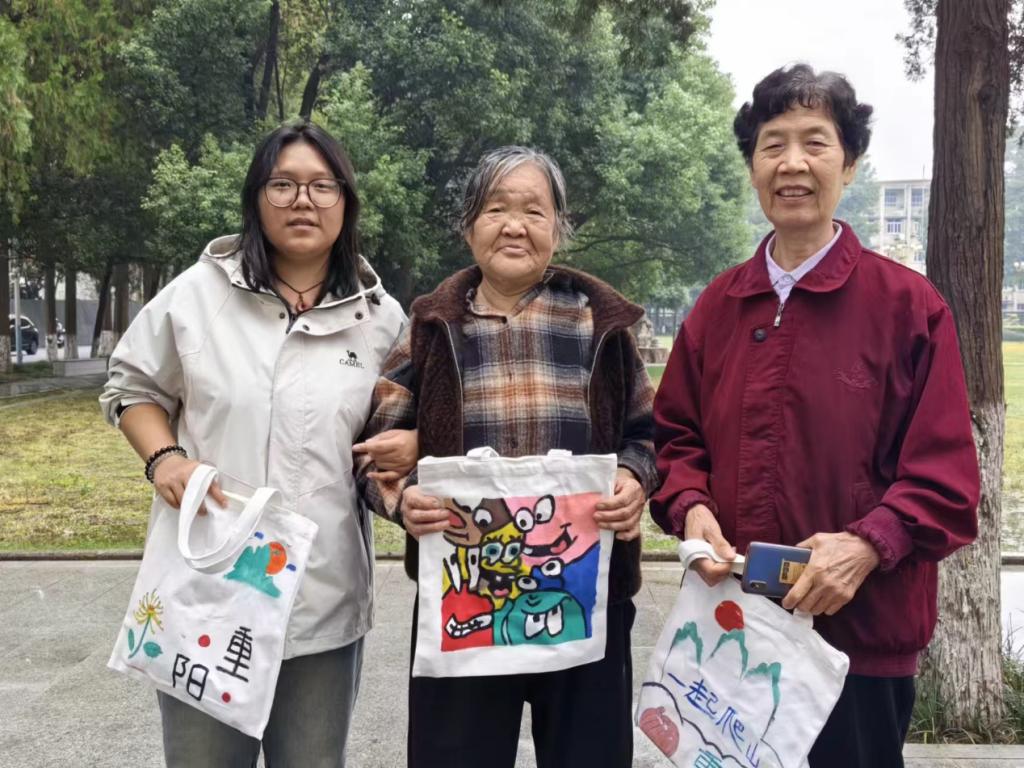 活动过程中,我院学生围绕“重阳敬老,爱满金秋”的主题进行手工DIY创作。同学们积极发挥创新意识,以重阳节的节日元素进行设计折纸创作,象征着美好金秋的菊花、象征着长寿与健康的寿桃、寓意美好的长寿面以及写满对老人们祝福语的贺卡,这些栩栩如生的折纸作品不仅展现了同学们精湛的折纸技艺,更表达了他们对老人们的深深祝福。擅长彩绘的同学们用五彩的画笔在空白的帆布袋上进行彩绘,他们将对长辈的敬爱之情融入到创作的环节中,希望这些亲手制作的作品能够为老人们带来温暖和快乐。还有一些同学发挥创意,利用废旧物品进行改造,制作出了独具特色的重阳节主题手工艺品,既环保又富有创意。同学们在制作过程中互相交流、互相帮助,分享着自己的创意和心得,现场氛围轻松愉悦。活动最后,同学们将自己的作品进行了展示,并评选出了一批优秀的帆布袋作品赠送给我校家属区居住的老人们,为老人们送上一份特别的重阳节礼物,让老人们感受到大学生们的关爱和祝福度过了一个温馨快乐的重阳节,充分表现出我院学生对老年群体的敬爱之心。