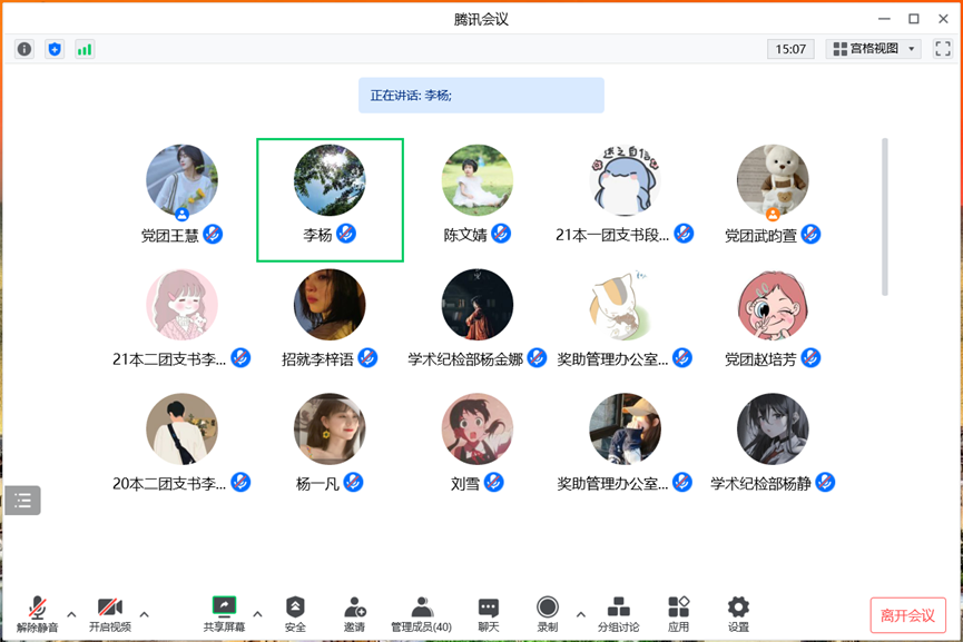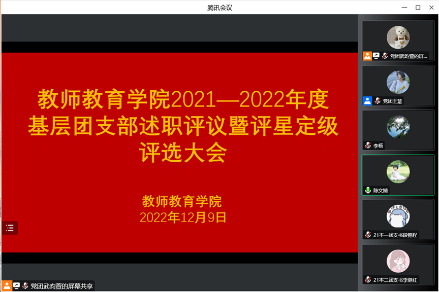 12月9日晚,太阳成集团tyc151cc线上召开2021—2022年度基层团支部述职评议暨评星定级评选大会。学院团委书记李杨、辅导员徐亚南、班主任陈文婧和王召召,各班团支书及学生代表共同参与此次会议,会议由武昀萱主持。