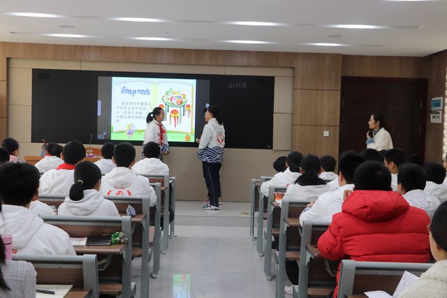 第二节观摩的是七年级张平老师的英语课。张老师首先对学生的课后作业完成情况进行了检查,并让学生以小组的形式进行展示。教学过程中,积极鼓励学生踊跃发言,感受英语学习与汉语学习的差异,通过小组合作学习的形式,锻炼学生的英语口语能力,充分调动学生敢说、想说、能说的积极性,提高学生的课堂参与度。张老师标准的英文发音、活跃的课堂氛围,令观摩师生赞叹不已。
