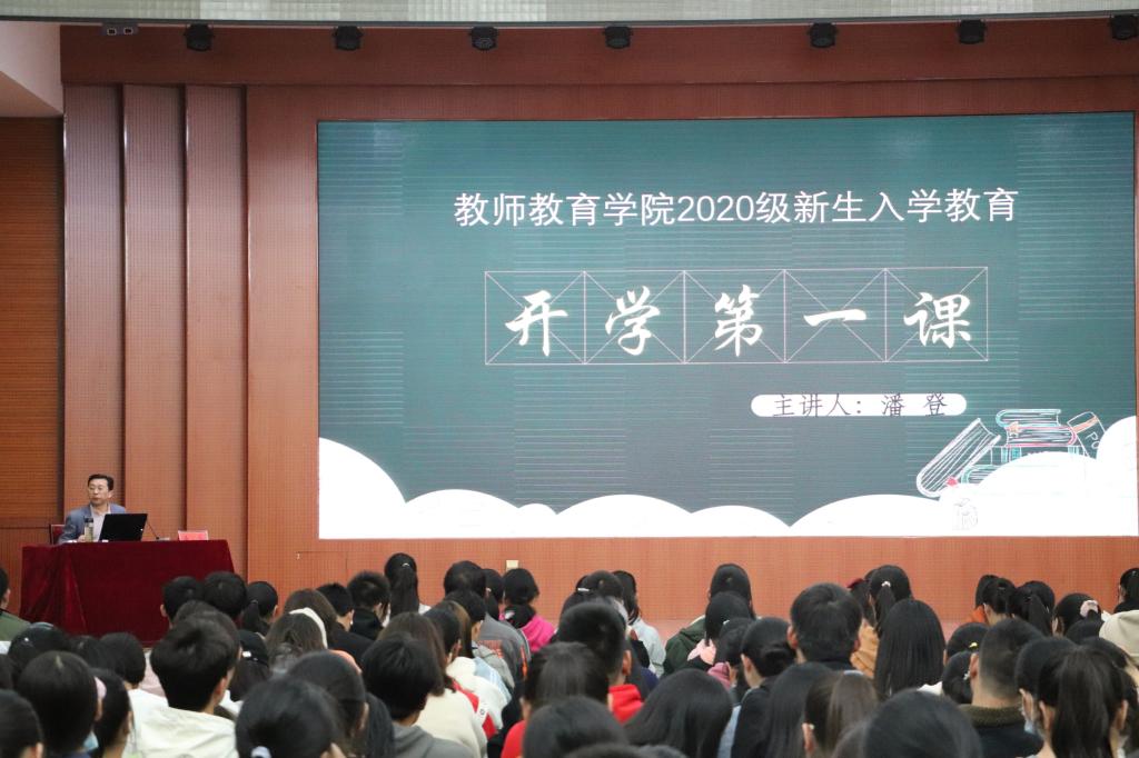 启动仪式过后,潘登作为主讲人,围绕“学校文化、学习教育、大学生活”三大板块,结合国家新形势、新要求,从学校、学院和学生三个方面为新生讲了入学教育第一课。学校方面,以校训“厚德崇实、善学敏行”为主题,详细介绍了学校定位、目标、使命、理念、战略及文化,同时展示了学校“一山为根基,一湖一河为两翼”的三大校区建设蓝图,充分展现了学校综合实力和社会影响力的提升;学院方面,潘登着重讲述了学院师资力量和办学条件的优势,并表明学院成立旨在整合教师教育资源,深化教师教育改革,创新教师教育人才培养模式,打造教师教育特色品牌;学生教育方面,他强调要注重学生德智体美全面发展,关注学生人身财产、心理、思想等各方面的安全,并从学习专业知识和提升综自身能力方面对新生提出更高要求。