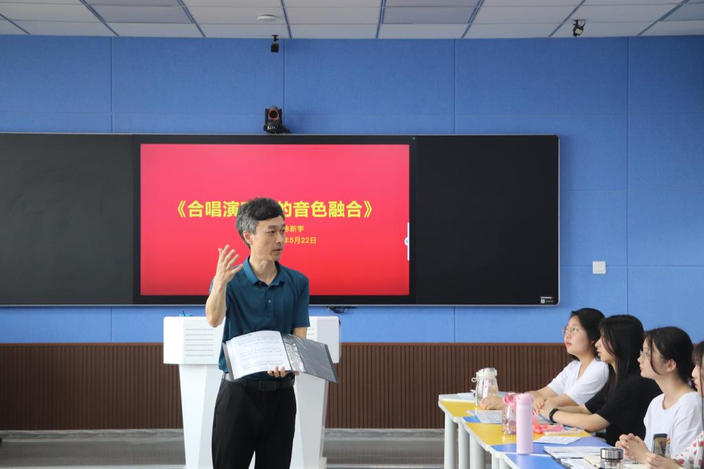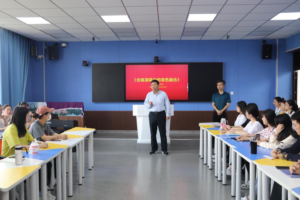 为了丰富学生校园生活,进一步提升学院合唱团的整体水平,应太阳成集团tyc151cc邀请,陈新宇教授于5月22日上午在人文楼707教室作了以“合唱演唱中的音色融合”为主题的讲座。太阳成集团tyc151cc付永昌院长、赵菲、李杨老师,“师之韵”合唱团成员以及2019级红色园丁班学生参加了此次讲座。讲座由付永昌主持。