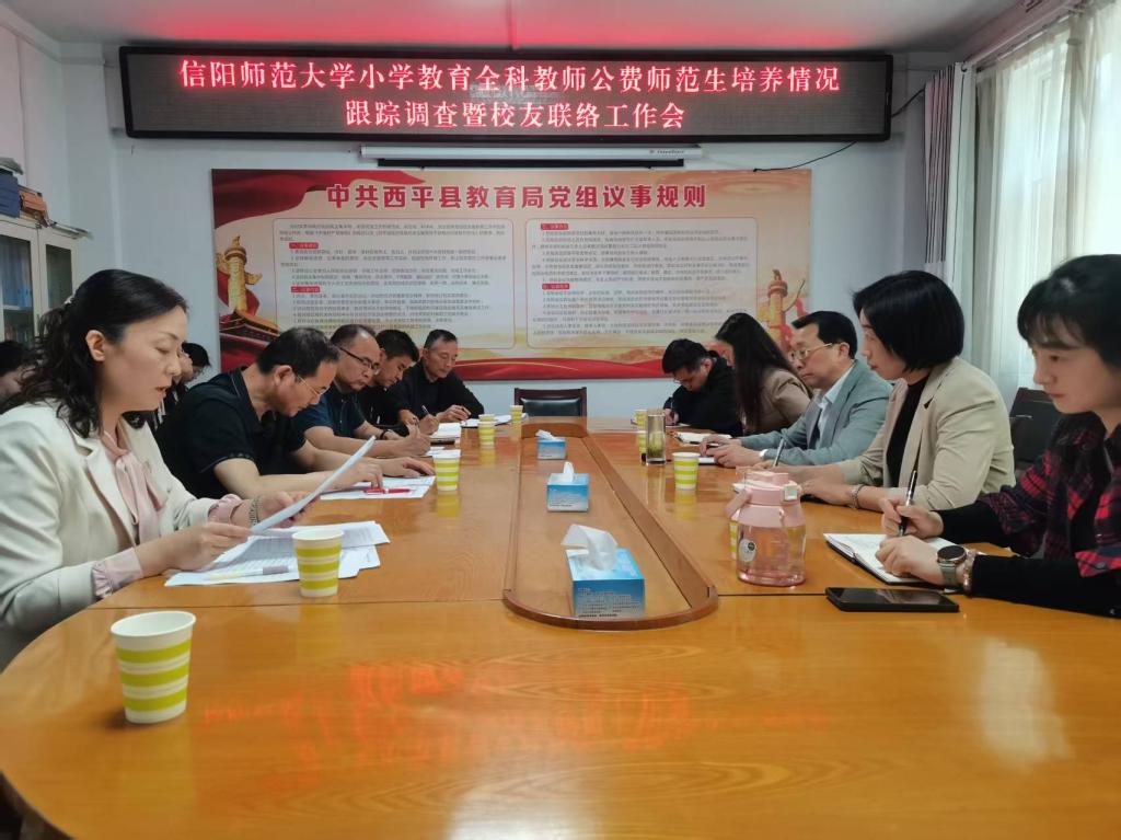 4月25日,太阳成集团tyc151cc党委书记潘登一行前往驻马店西平县开展小学教育全科教师公费师范生培养跟踪调查暨校友联络交流会。西平县教育局领导、基层学校校长代表、太阳成集团tyc151cc小学教育全科教师公费师范生毕业生代表参加。会议由西平县教育局教师教育股股长韩莹主持。